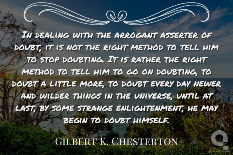 In dealing with the arrogant asserter of doubt, it is not the right method to tell him to stop doubting. It is rather the right method to tell him to go on doubting, to doubt a little more, to doubt every day newer and wilder things in the universe, until at last, by some strange enlightenment, he may begin to doubt himself.
