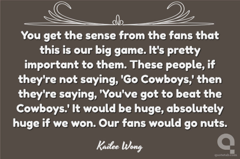 You get the sense from the fans that this is our big game. It's pretty important to them. These people, if they're not saying, 'Go Cowboys,' then they're saying, 'You've got to beat the Cowboys.' It would be huge, absolutely huge if we won. Our fans would go nuts.
