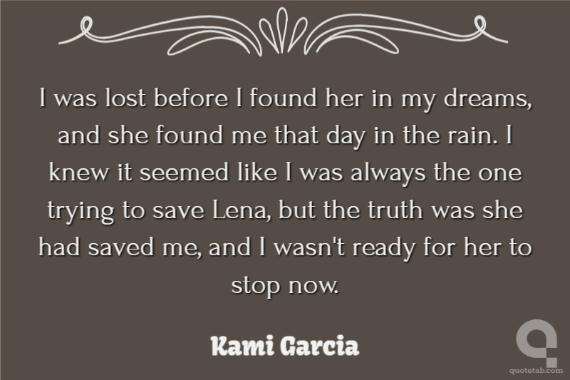 I was lost before I found her in my dreams, and she found me that day in the rain. I knew it seemed like I was always the one trying to save Lena, but the truth was she had saved me, and I wasn't ready for her to stop now.