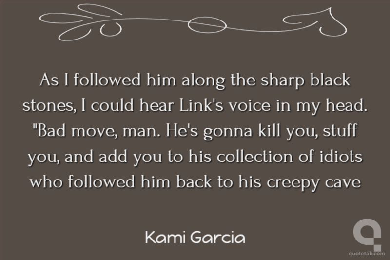 As I followed him along the sharp black stones, I could hear Link's voice in my head. "Bad move, man. He's gonna kill you, stuff you, and add you to his collection of idiots who followed him back to his creepy cave