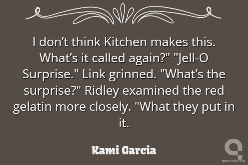I don’t think Kitchen makes this. What’s it called again?" "Jell-O Surprise." Link grinned. "What’s the surprise?" Ridley examined the red gelatin more closely. "What they put in it.