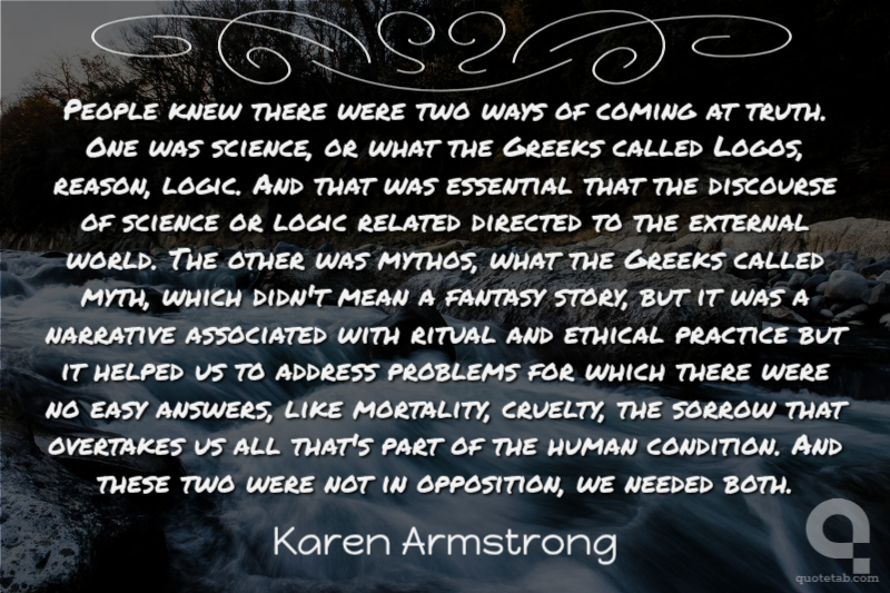 People knew there were two ways of coming at truth. One was science, or what the Greeks called Logos, reason, logic. And that was essential that the discourse of science or logic related directed to the external world. The other was mythos, what the Greeks called myth, which didn't mean a fantasy story, but it was a narrative associated with ritual and ethical practice but it helped us to address problems for which there were no easy answers, like mortality, cruelty, the sorrow that overtakes us all that's part of the human condition. And these two were not in opposition, we needed both.