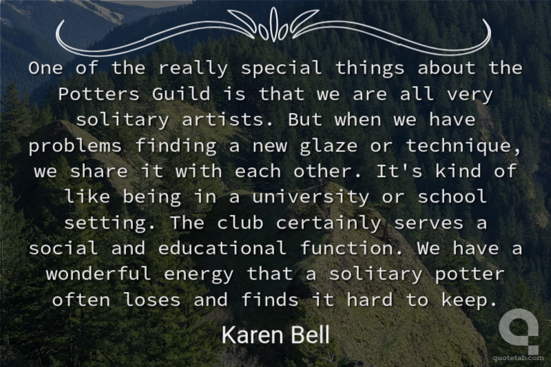 One of the really special things about the Potters Guild is that we are all very solitary artists. But when we have problems finding a new glaze or technique, we share it with each other. It's kind of like being in a university or school setting. The club certainly serves a social and educational function. We have a wonderful energy that a solitary potter often loses and finds it hard to keep.