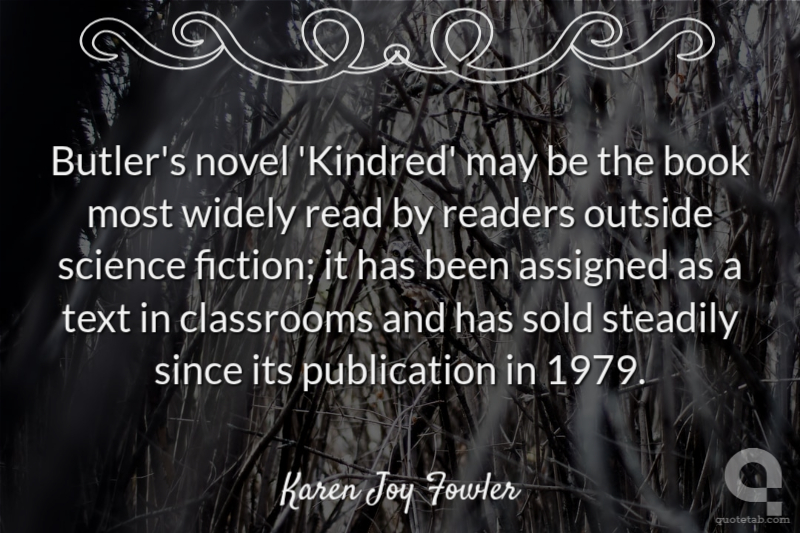 Butler's novel 'Kindred' may be the book most widely read by readers outside science fiction; it has been assigned as a text in classrooms and has sold steadily since its publication in 1979.