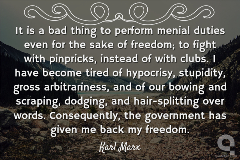 It is a bad thing to perform menial duties even for the sake of freedom; to fight with pinpricks, instead of with clubs. I have become tired of hypocrisy, stupidity, gross arbitrariness, and of our bowing and scraping, dodging, and hair-splitting over words. Consequently, the government has given me back my freedom.