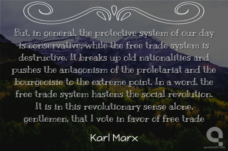 But, in general, the protective system of our day is conservative, while the free trade system is destructive. It breaks up old nationalities and pushes the antagonism of the proletariat and the bourgeoisie to the extreme point. In a word, the free trade system hastens the social revolution. It is in this revolutionary sense alone, gentlemen, that I vote in favor of free trade