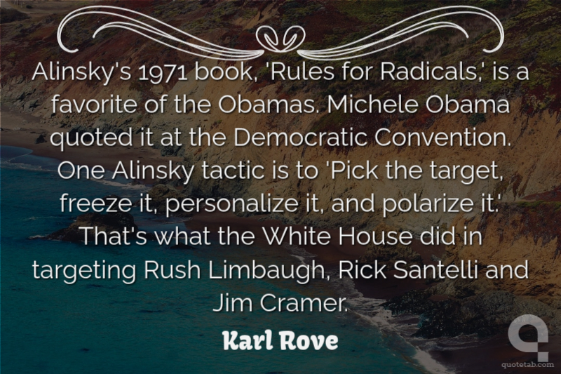 Alinsky's 1971 book, 'Rules for Radicals,' is a favorite of the Obamas. Michele Obama quoted it at the Democratic Convention. One Alinsky tactic is to 'Pick the target, freeze it, personalize it, and polarize it.' That's what the White House did in targeting Rush Limbaugh, Rick Santelli and Jim Cramer.