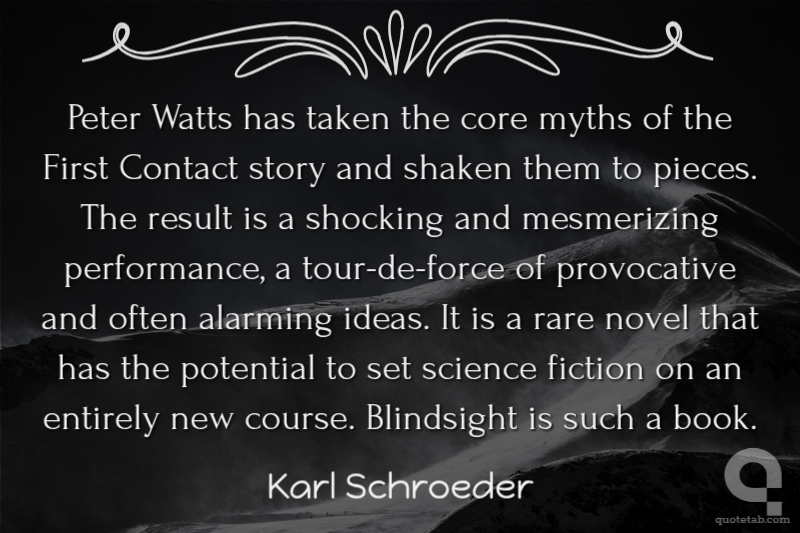 Peter Watts has taken the core myths of the First Contact story and shaken them to pieces. The result is a shocking and mesmerizing performance, a tour-de-force of provocative and often alarming ideas. It is a rare novel that has the potential to set science fiction on an entirely new course. Blindsight is such a book.