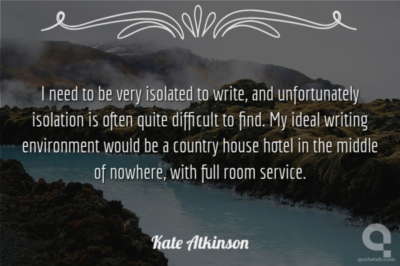 I need to be very isolated to write, and unfortunately isolation is often quite difficult to find. My ideal writing environment would be a country house hotel in the middle of nowhere, with full room service.