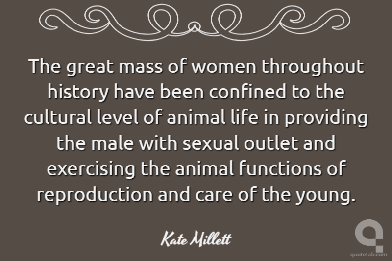 The great mass of women throughout history have been confined to the cultural level of animal life in providing the male with sexual outlet and exercising the animal functions of reproduction and care of the young.