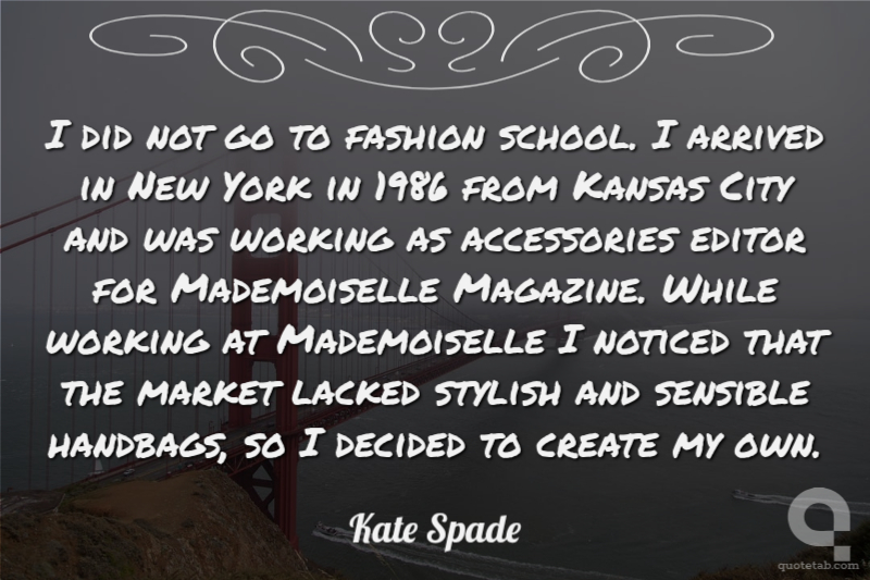 I did not go to fashion school. I arrived in New York in 1986 from Kansas City and was working as accessories editor for Mademoiselle Magazine. While working at Mademoiselle I noticed that the market lacked stylish and sensible handbags, so I decided to create my own.
