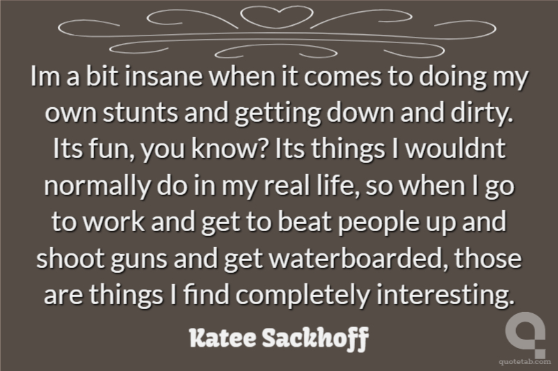 Im a bit insane when it comes to doing my own stunts and getting down and dirty. Its fun, you know? Its things I wouldnt normally do in my real life, so when I go to work and get to beat people up and shoot guns and get waterboarded, those are things I find completely interesting.