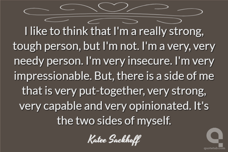I like to think that I'm a really strong, tough person, but I'm not. I'm a very, very needy person. I'm very insecure. I'm very impressionable. But, there is a side of me that is very put-together, very strong, very capable and very opinionated. It's the two sides of myself.