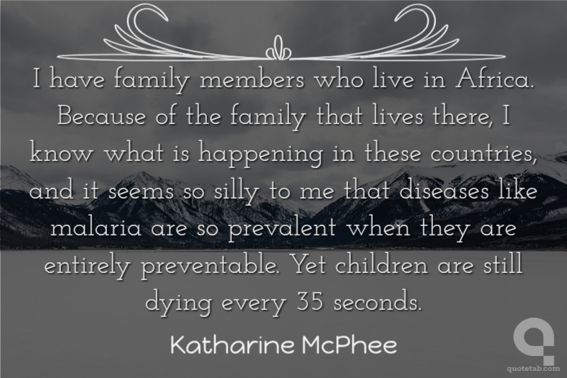 I have family members who live in Africa. Because of the family that lives there, I know what is happening in these countries, and it seems so silly to me that diseases like malaria are so prevalent when they are entirely preventable. Yet children are still dying every 35 seconds.