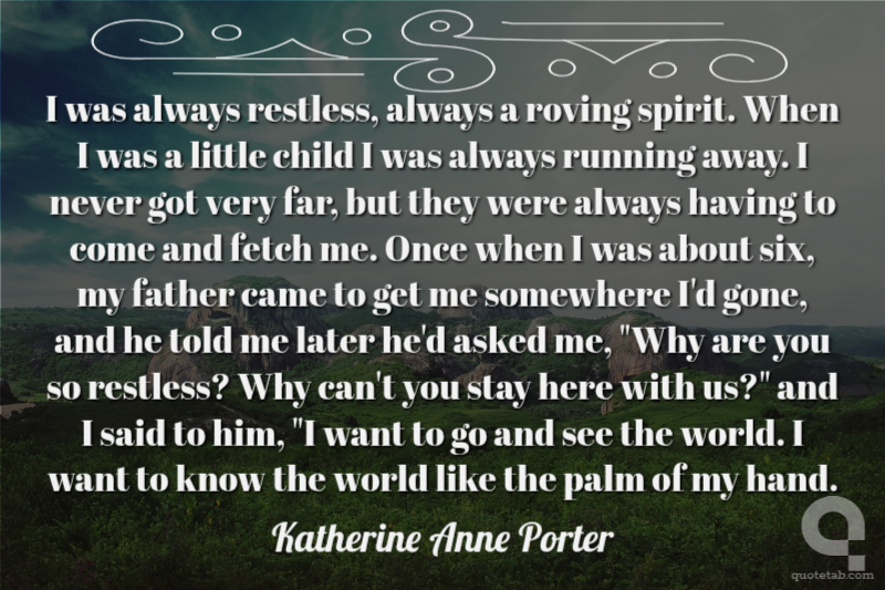 I was always restless, always a roving spirit. When I was a little child I was always running away. I never got very far, but they were always having to come and fetch me. Once when I was about six, my father came to get me somewhere I'd gone, and he told me later he'd asked me, "Why are you so restless? Why can't you stay here with us?" and I said to him, "I want to go and see the world. I want to know the world like the palm of my hand.