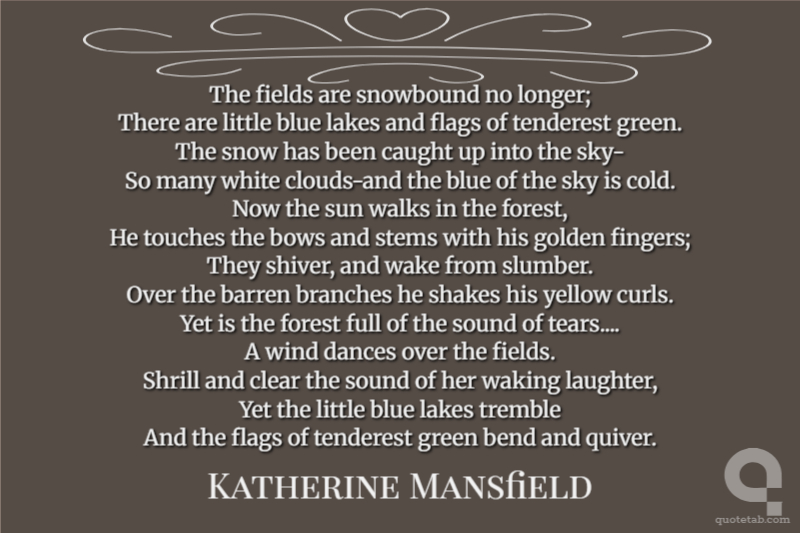 The fields are snowbound no longer; There are little blue lakes and flags of tenderest green. The snow has been caught up into the sky- So many white clouds-and the blue of the sky is cold. Now the sun walks in the forest, He touches the bows and stems with his golden fingers; They shiver, and wake from slumber. Over the barren branches he shakes his yellow curls. Yet is the forest full of the sound of tears.... A wind dances over the fields. Shrill and clear the sound of her waking laughter, Yet the little blue lakes tremble And the flags of tenderest green bend and quiver.
