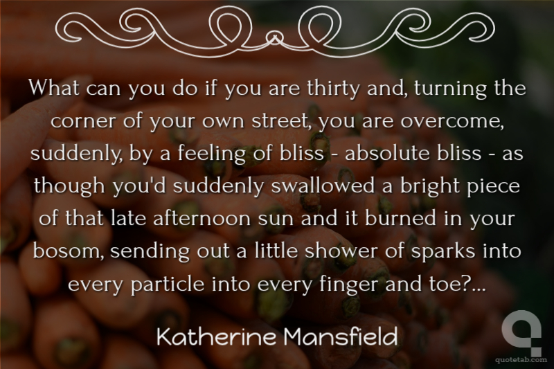 What can you do if you are thirty and, turning the corner of your own street, you are overcome, suddenly, by a feeling of bliss - absolute bliss - as though you'd suddenly swallowed a bright piece of that late afternoon sun and it burned in your bosom, sending out a little shower of sparks into every particle into every finger and toe?...