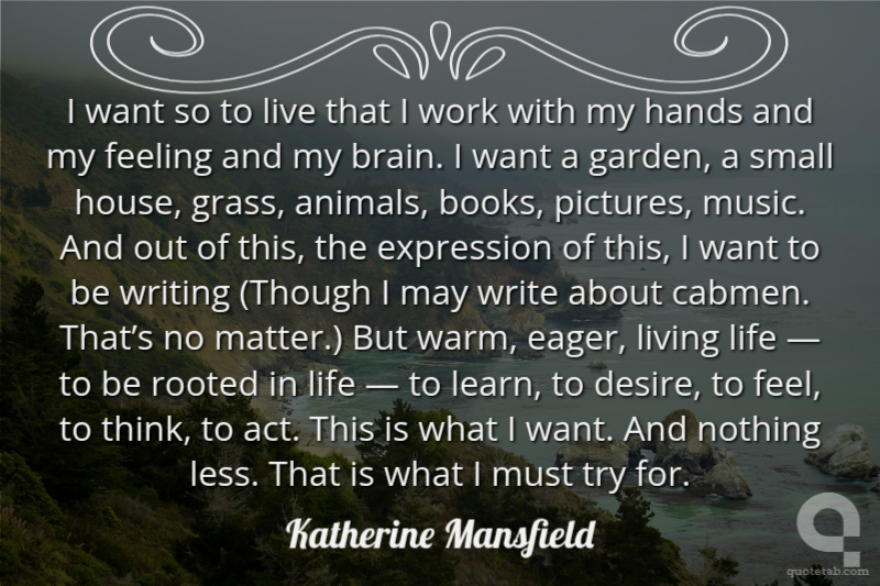 I want so to live that I work with my hands and my feeling and my brain. I want a garden, a small house, grass, animals, books, pictures, music. And out of this, the expression of this, I want to be writing (Though I may write about cabmen. That’s no matter.) But warm, eager, living life — to be rooted in life — to learn, to desire, to feel, to think, to act. This is what I want. And nothing less. That is what I must try for.