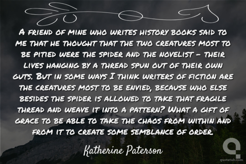 A friend of mine who writes history books said to me that he thought that the two creatures most to be pitied were the spider and the novelist - their lives hanging by a thread spun out of their own guts. But in some ways I think writers of fiction are the creatures most to be envied, because who else besides the spider is allowed to take that fragile thread and weave it into a pattern? What a gift of grace to be able to take the chaos from within and from it to create some semblance of order.