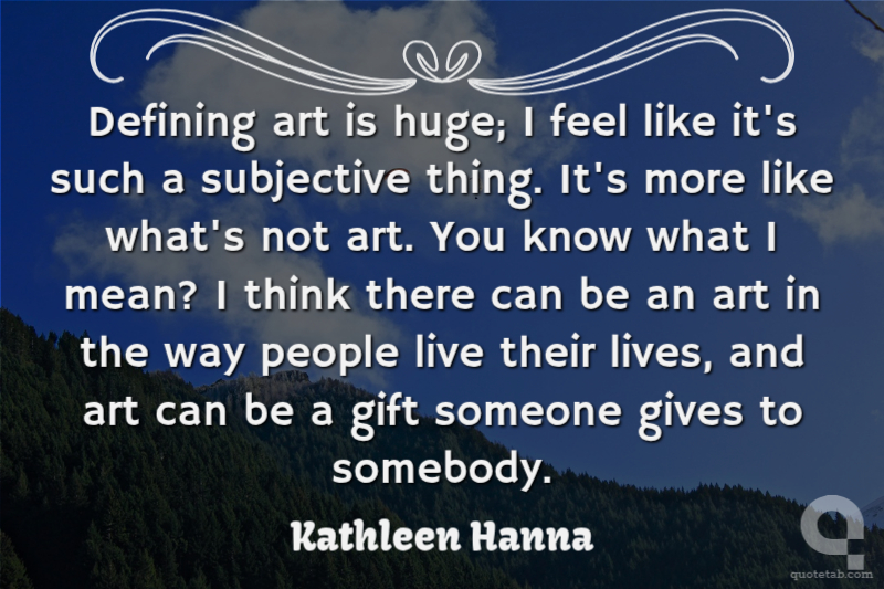 Defining art is huge; I feel like it's such a subjective thing. It's more like what's not art. You know what I mean? I think there can be an art in the way people live their lives, and art can be a gift someone gives to somebody.