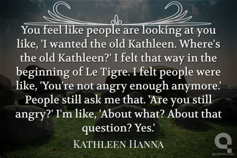You feel like people are looking at you like, 'I wanted the old Kathleen. Where's the old Kathleen?' I felt that way in the beginning of Le Tigre. I felt people were like, 'You're not angry enough anymore.' People still ask me that. 'Are you still angry?' I'm like, 'About what? About that question? Yes.'