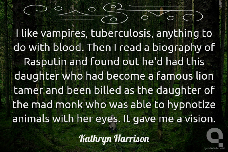 I like vampires, tuberculosis, anything to do with blood. Then I read a biography of Rasputin and found out he'd had this daughter who had become a famous lion tamer and been billed as the daughter of the mad monk who was able to hypnotize animals with her eyes. It gave me a vision.