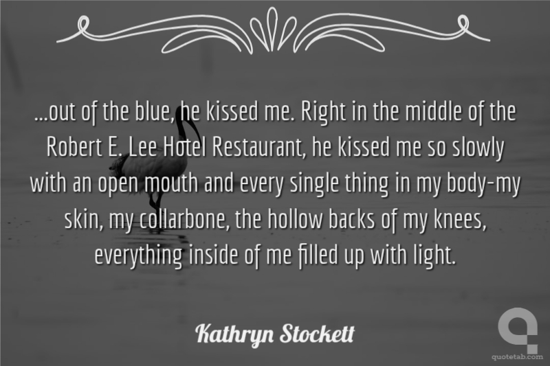 ...out of the blue, he kissed me. Right in the middle of the Robert E. Lee Hotel Restaurant, he kissed me so slowly with an open mouth and every single thing in my body-my skin, my collarbone, the hollow backs of my knees, everything inside of me filled up with light.