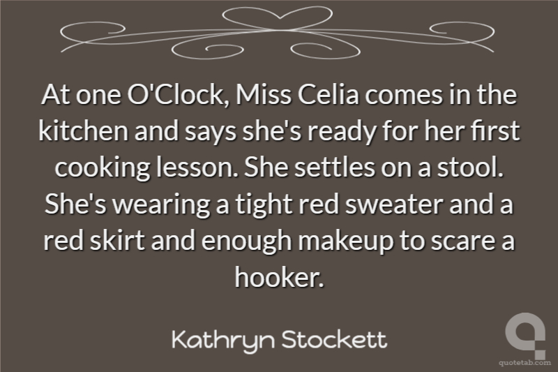 At one O'Clock, Miss Celia comes in the kitchen and says she's ready for her first cooking lesson. She settles on a stool. She's wearing a tight red sweater and a red skirt and enough makeup to scare a hooker.