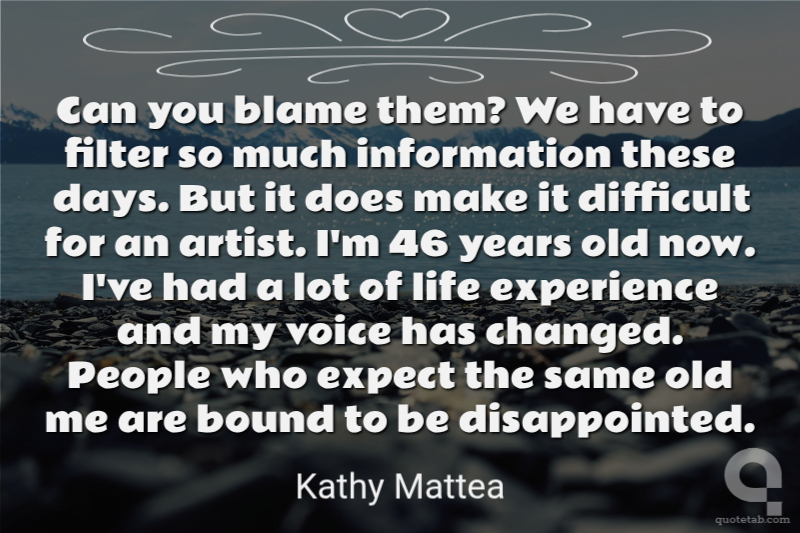Can you blame them? We have to filter so much information these days. But it does make it difficult for an artist. I'm 46 years old now. I've had a lot of life experience and my voice has changed. People who expect the same old me are bound to be disappointed.