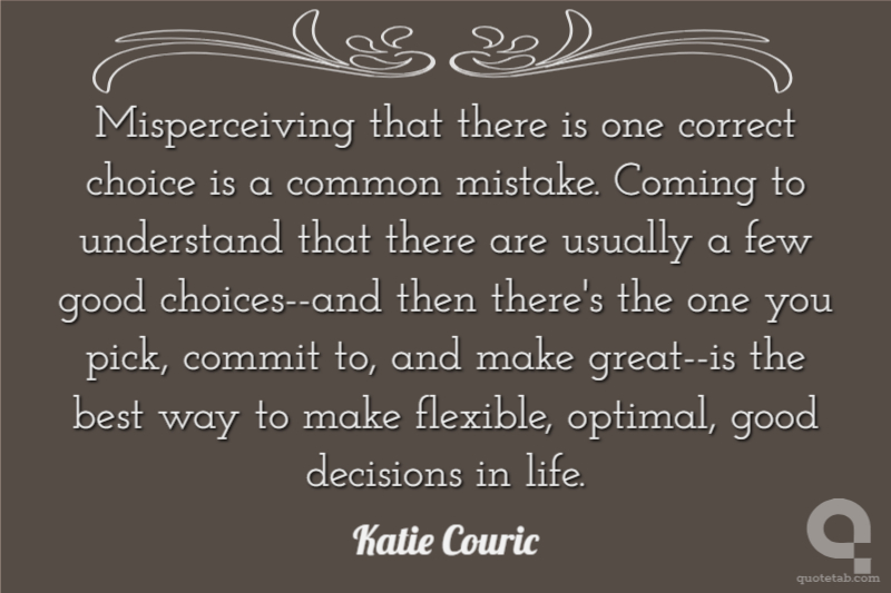 Misperceiving that there is one correct choice is a common mistake. Coming to understand that there are usually a few good choices--and then there's the one you pick, commit to, and make great--is the best way to make flexible, optimal, good decisions in life.