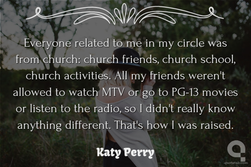 Everyone related to me in my circle was from church: church friends, church school, church activities. All my friends weren't allowed to watch MTV or go to PG-13 movies or listen to the radio, so I didn't really know anything different. That's how I was raised.