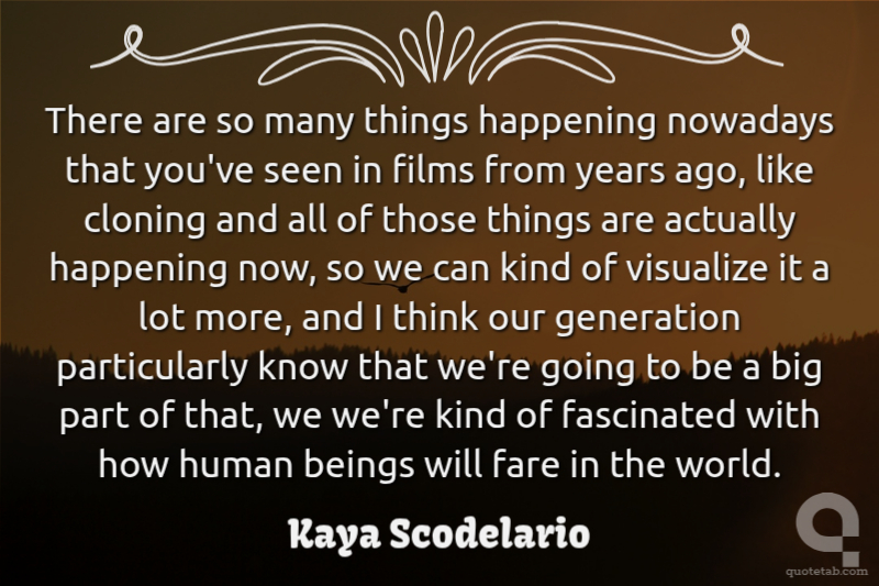 There are so many things happening nowadays that you've seen in films from years ago, like cloning and all of those things are actually happening now, so we can kind of visualize it a lot more, and I think our generation particularly know that we're going to be a big part of that, we we're kind of fascinated with how human beings will fare in the world.