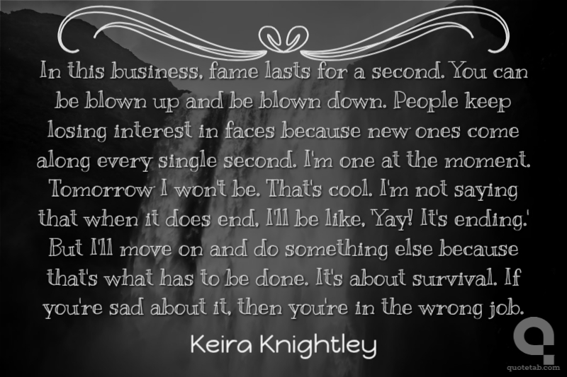 In this business, fame lasts for a second. You can be blown up and be blown down. People keep losing interest in faces because new ones come along every single second. I'm one at the moment. Tomorrow I won't be. That's cool. I'm not saying that when it does end, I'll be like, 'Yay! It's ending.' But I'll move on and do something else because that's what has to be done. It's about survival. If you're sad about it, then you're in the wrong job.