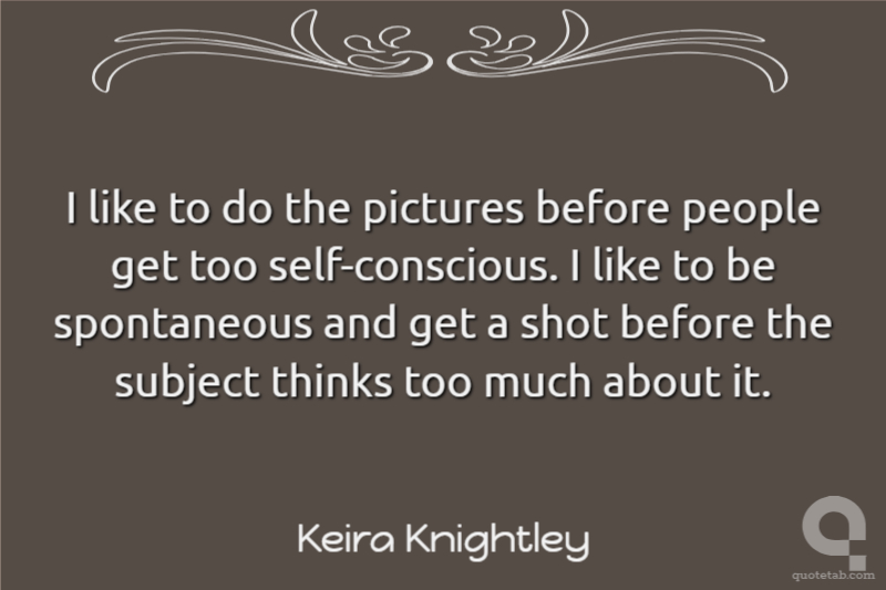 I like to do the pictures before people get too self-conscious. I like to be spontaneous and get a shot before the subject thinks too much about it.