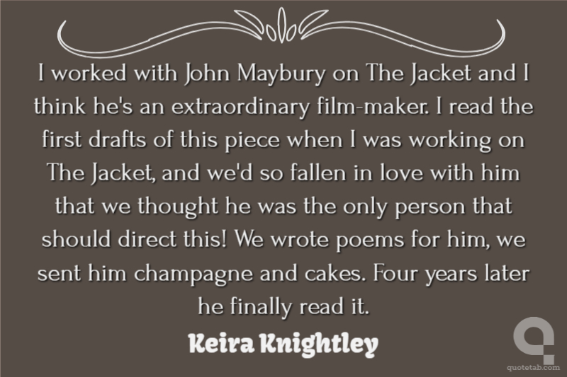 I worked with John Maybury on The Jacket and I think he's an extraordinary film-maker. I read the first drafts of this piece when I was working on The Jacket, and we'd so fallen in love with him that we thought he was the only person that should direct this! We wrote poems for him, we sent him champagne and cakes. Four years later he finally read it.