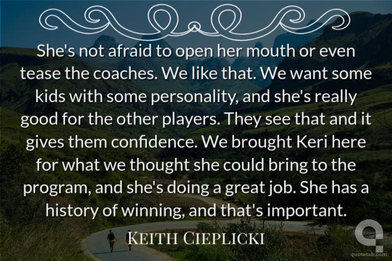 She's not afraid to open her mouth or even tease the coaches. We like that. We want some kids with some personality, and she's really good for the other players. They see that and it gives them confidence. We brought Keri here for what we thought she could bring to the program, and she's doing a great job. She has a history of winning, and that's important.