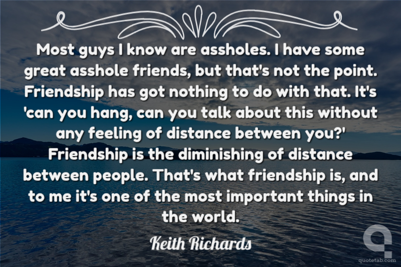 Most guys I know are assholes. I have some great asshole friends, but that's not the point. Friendship has got nothing to do with that. It's 'can you hang, can you talk about this without any feeling of distance between you?' Friendship is the diminishing of distance between people. That's what friendship is, and to me it's one of the most important things in the world.