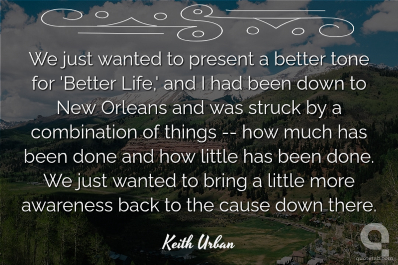 We just wanted to present a better tone for 'Better Life,' and I had been down to New Orleans and was struck by a combination of things -- how much has been done and how little has been done. We just wanted to bring a little more awareness back to the cause down there.