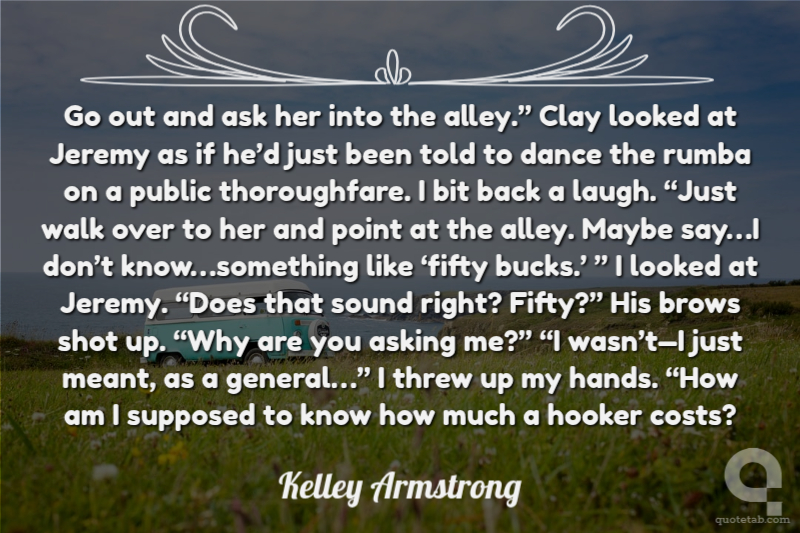Go out and ask her into the alley.” Clay looked at Jeremy as if he’d just been told to dance the rumba on a public thoroughfare. I bit back a laugh. “Just walk over to her and point at the alley. Maybe say…I don’t know…something like ‘fifty bucks.’ ” I looked at Jeremy. “Does that sound right? Fifty?” His brows shot up. “Why are you asking me?” “I wasn’t—I just meant, as a general…” I threw up my hands. “How am I supposed to know how much a hooker costs?