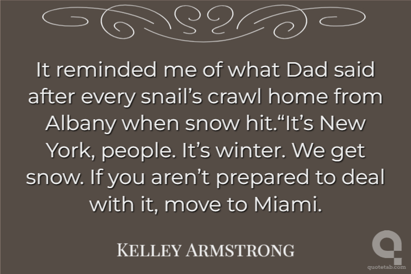 It reminded me of what Dad said after every snail’s crawl home from Albany when snow hit.“It’s New York, people. It’s winter. We get snow. If you aren’t prepared to deal with it, move to Miami.