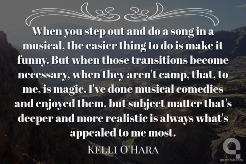 When you step out and do a song in a musical, the easier thing to do is make it funny. But when those transitions become necessary, when they aren't camp, that, to me, is magic. I've done musical comedies and enjoyed them, but subject matter that's deeper and more realistic is always what's appealed to me most.