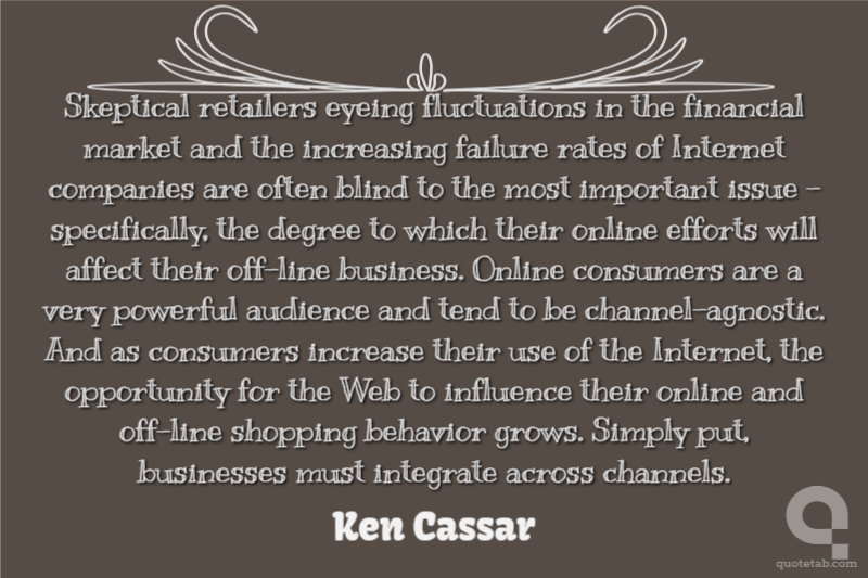 Skeptical retailers eyeing fluctuations in the financial market and the increasing failure rates of Internet companies are often blind to the most important issue - specifically, the degree to which their online efforts will affect their off-line business. Online consumers are a very powerful audience and tend to be channel-agnostic. And as consumers increase their use of the Internet, the opportunity for the Web to influence their online and off-line shopping behavior grows. Simply put, businesses must integrate across channels.