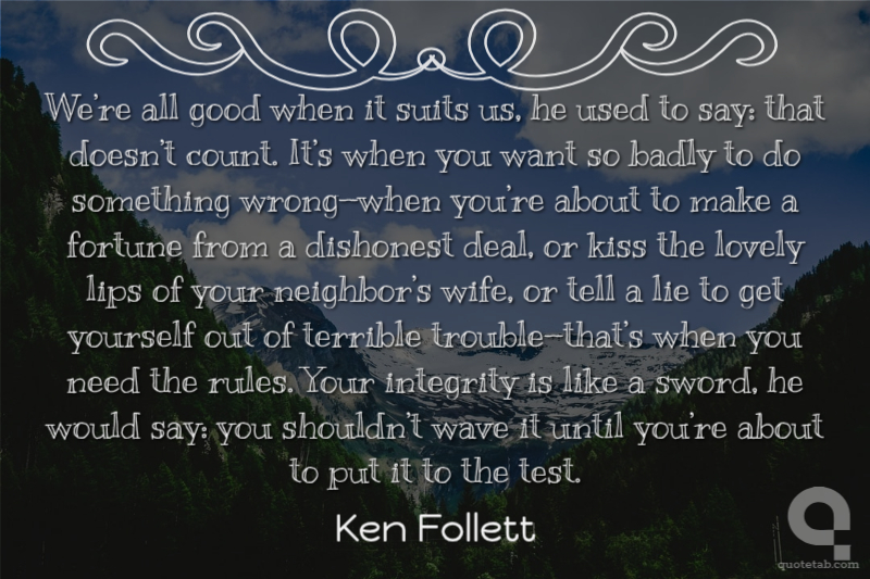 We’re all good when it suits us, he used to say: that doesn’t count. It’s when you want so badly to do something wrong—when you’re about to make a fortune from a dishonest deal, or kiss the lovely lips of your neighbor’s wife, or tell a lie to get yourself out of terrible trouble—that’s when you need the rules. Your integrity is like a sword, he would say: you shouldn’t wave it until you’re about to put it to the test.