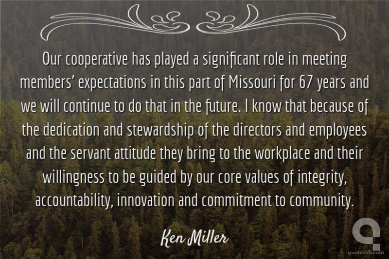 Our cooperative has played a significant role in meeting members' expectations in this part of Missouri for 67 years and we will continue to do that in the future. I know that because of the dedication and stewardship of the directors and employees and the servant attitude they bring to the workplace and their willingness to be guided by our core values of integrity, accountability, innovation and commitment to community.