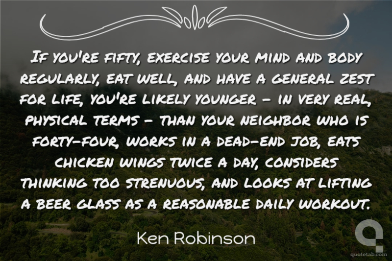 If you're fifty, exercise your mind and body regularly, eat well, and have a general zest for life, you're likely younger - in very real, physical terms - than your neighbor who is forty-four, works in a dead-end job, eats chicken wings twice a day, considers thinking too strenuous, and looks at lifting a beer glass as a reasonable daily workout.