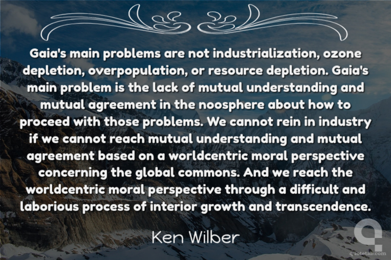 Gaia's main problems are not industrialization, ozone depletion, overpopulation, or resource depletion. Gaia's main problem is the lack of mutual understanding and mutual agreement in the noosphere about how to proceed with those problems. We cannot rein in industry if we cannot reach mutual understanding and mutual agreement based on a worldcentric moral perspective concerning the global commons. And we reach the worldcentric moral perspective through a difficult and laborious process of interior growth and transcendence.