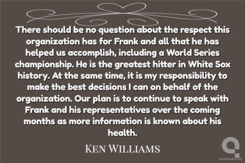 There should be no question about the respect this organization has for Frank and all that he has helped us accomplish, including a World Series championship. He is the greatest hitter in White Sox history. At the same time, it is my responsibility to make the best decisions I can on behalf of the organization. Our plan is to continue to speak with Frank and his representatives over the coming months as more information is known about his health.