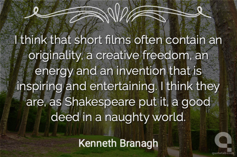 I think that short films often contain an originality, a creative freedom, an energy and an invention that is inspiring and entertaining. I think they are, as Shakespeare put it, a good deed in a naughty world.