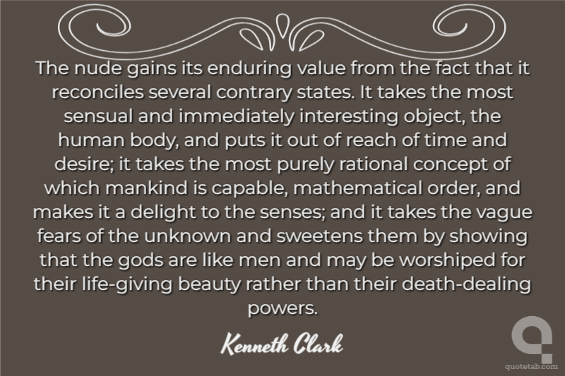 The nude gains its enduring value from the fact that it reconciles several contrary states. It takes the most sensual and immediately interesting object, the human body, and puts it out of reach of time and desire; it takes the most purely rational concept of which mankind is capable, mathematical order, and makes it a delight to the senses; and it takes the vague fears of the unknown and sweetens them by showing that the gods are like men and may be worshiped for their life-giving beauty rather than their death-dealing powers.