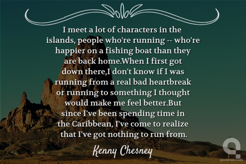 I meet a lot of characters in the islands, people who're running -- who're happier on a fishing boat than they are back home.When I first got down there,I don't know if I was running from a real bad heartbreak or running to something I thought would make me feel better.But since I've been spending time in the Caribbean, I've come to realize that I've got nothing to run from.